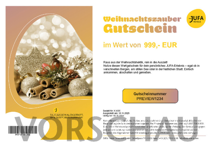 Raus aus der Weihnachtshektik, rein in die Auszeit!<br>Nutze diesen Wertgutschein für dein persönliches JUFA-Erlebnis – egal ob in verschneiten Bergen, am stillen See oder in der festlichen Stadt. Einfach ankommen, abschalten und genießen.