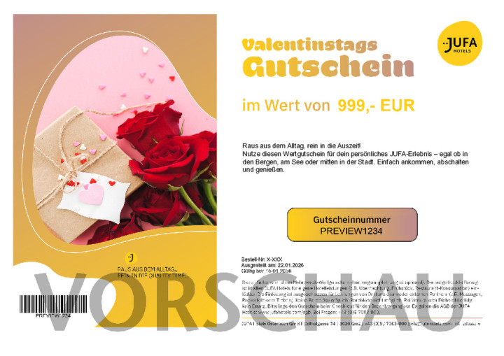 Raus aus dem Alltag, rein in die gemeinsame Zeit!<br>Nutze diesen Wertgutschein für dein persönliches JUFA-Erlebnis - ob alleine oder mit deinem Herzensmenschen! Einfach ankommen, abschalten und genießen!<br>